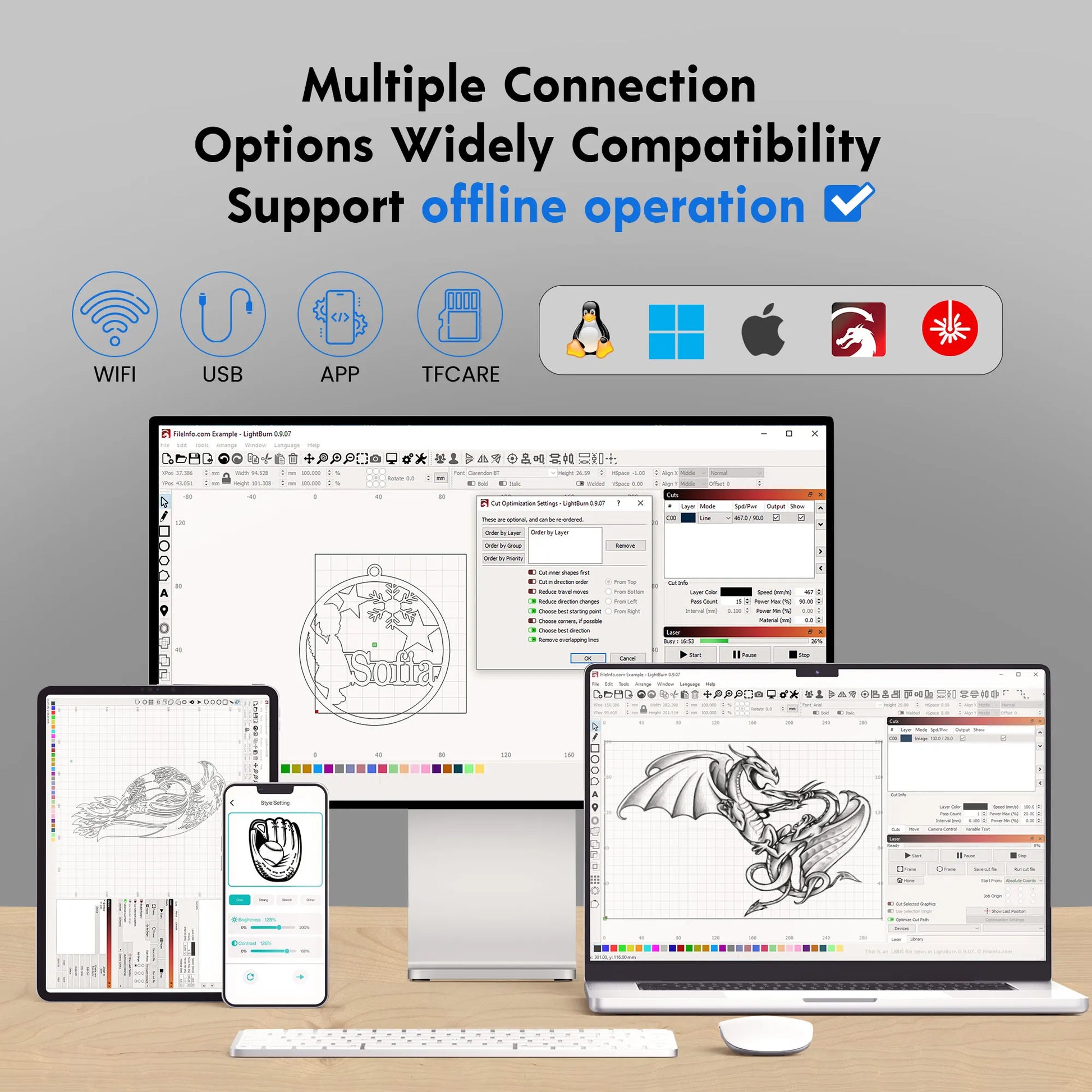 - Flexible workflow with LaserGRBL and LightBurn support, USB/TF Card/WiFi, and multi‑machine control from a single PC to boost productivity.